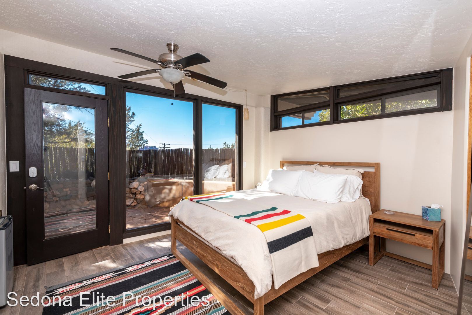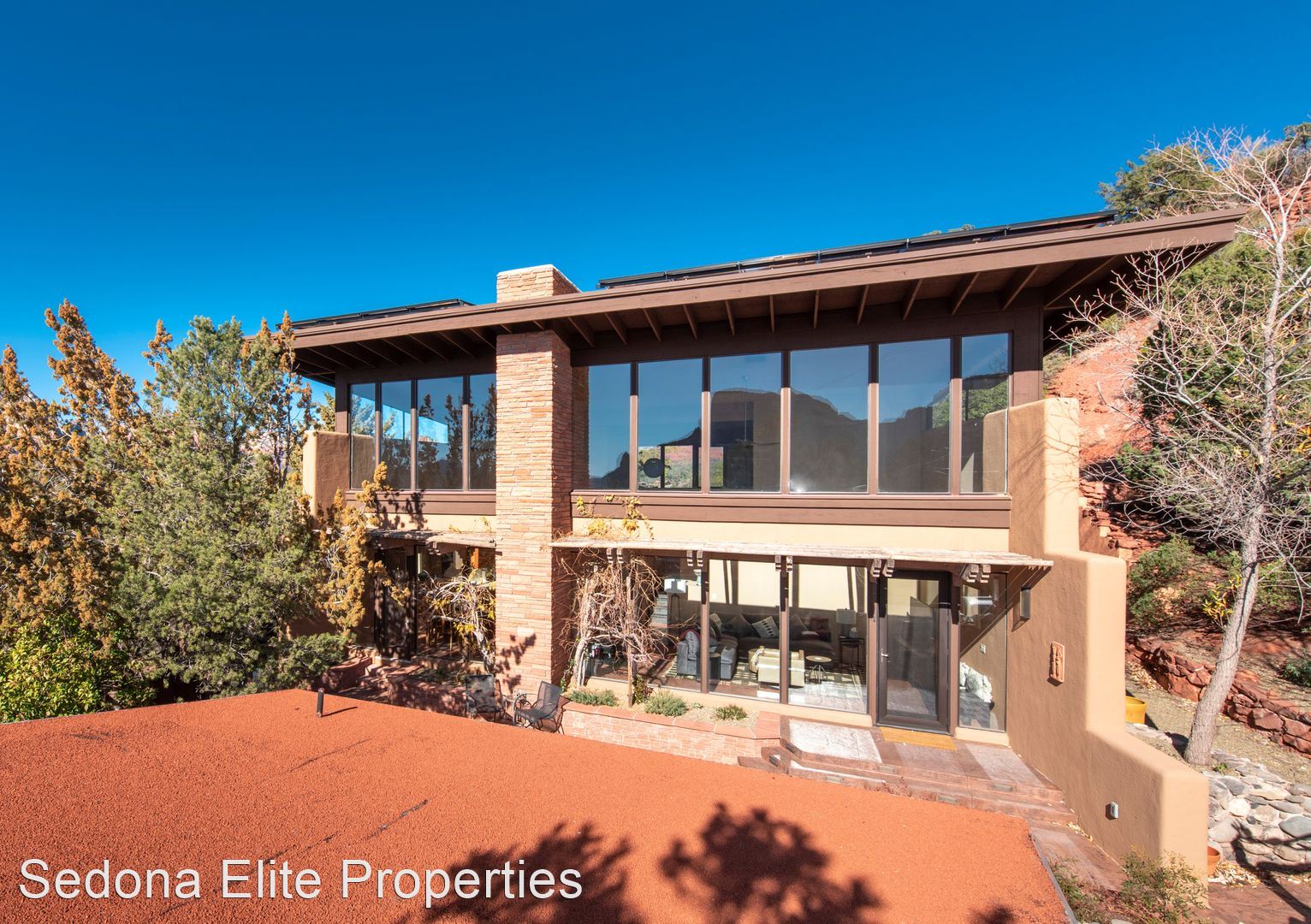 40 Pinewood Drive - Sedona - $5,900/mo - This incredible contemporary home is beautifully situated atop a hill with an array of unobstructed red rock views and offers a unique combination of Zen privacy and convenience to shops, restaurants, and Tlaquepaque experiences. With an abundance of floor to ceiling windows to let the sun and nature-scapes into the home, a true Sedona retreat experience awaits. The main floor offers a living room, with a pellet stove, smart TV, and dining room with unique wood carved dining table adjacent to a gorgeous chefs kitchen. A guest bedroom with a king bed and a full bathroom is located on the main floor. Upstairs the master bedroom features elevated red rock views from the lofted open concept space. An en-suite bathroom shares in the abundance of views and offers a soaker tub, stand up tiled shower, double sinks, and a stack able washer/dryer unit. The outdoor living space offers a garden oasis feeling with a built in Sundance Spa, outdoor shower, and dining amidst a tranquil fountain setting. In addition to the main house, there is a detached studio Casita with a queen bed and en-suite bathroom with a shower. There is room for 2 cars in the driveway. No garage. Smart T.V. only. No Cable or Satellite. 30 Day Minimum Rental. ***SPECIAL OFFER $5,400 per month if rented 05/01/2022-08/31/2022*** $5,900/mo. All utilities included within reason. $1000 security deposit $550 non-refundable cleaning fee 1 Dog will be considered with a $500 pet deposit, $250 pet fee and completed pet application. This home is a smoke-free environment. **There is a home in the final stages of construction next door. Please contact the office about availability.